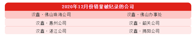 全力沖刺,圓滿收官。據(jù)漢鑫集團(tuán)運(yùn)營部統(tǒng)計(jì)的數(shù)據(jù)顯示,共有6家區(qū)域公司月度銷量屢創(chuàng)新高,11月、12月的銷量連續(xù)突破歷史紀(jì)錄。