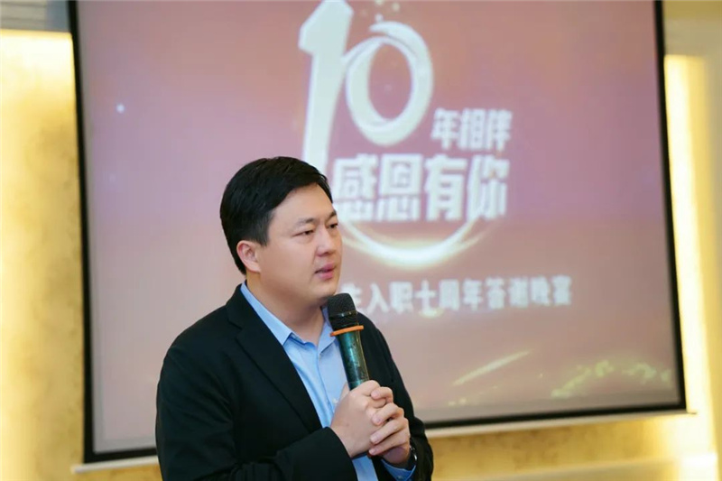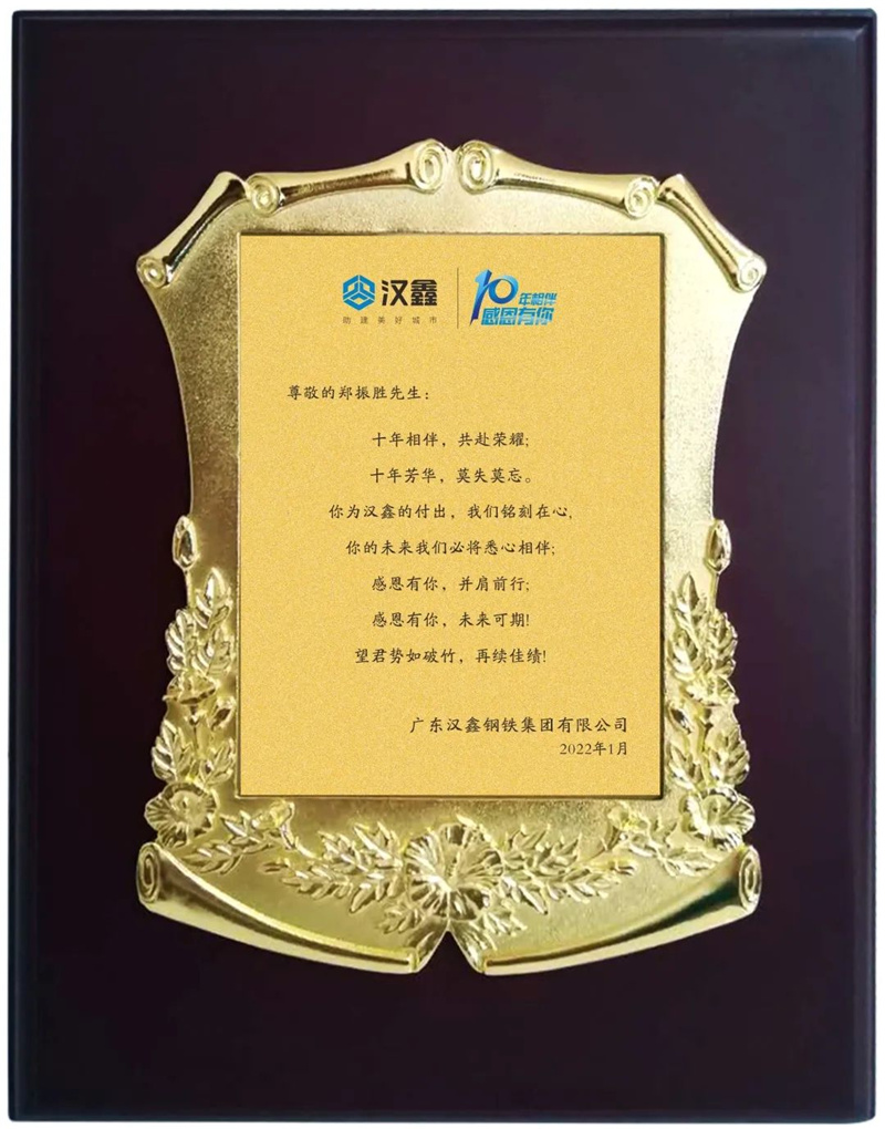 總裁代表集團(tuán)為鄭總送上十周年祝福,回顧?quán)嵖偧尤霛h鑫十年來的工作歷程,感謝鄭總在這些年為漢鑫、為揭陽公司的發(fā)展兢兢業(yè)業(yè)的付出、功高望重的貢獻(xiàn)。