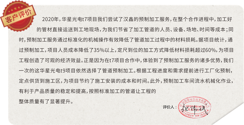 2020年,漢鑫為華星光電t7項(xiàng)目建設(shè)供應(yīng)大量管道產(chǎn)品,在合作過(guò)程中,漢鑫優(yōu)質(zhì)的產(chǎn)品和服務(wù)得到合作單位充分認(rèn)可,其中管道預(yù)制加工服務(wù)為客戶達(dá)到降本增效顯著效果。
