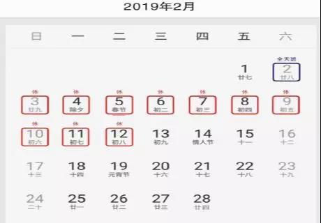為了歡慶傳統(tǒng)的新春佳節(jié),根據(jù)國(guó)家規(guī)定和我公司的具體情況,我公司春節(jié)放假時(shí)間定為:2019年2月3日-12日放假,13日(農(nóng)歷初九)正常上班。