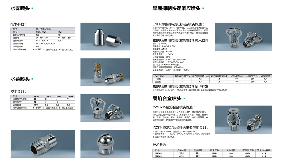 消防噴頭常用玻璃球、銅、易熔合金等作為主要材質(zhì),有多種觸發(fā)噴灑溫度點的規(guī)格,能廣泛適用到各種環(huán)境,是消防自動噴淋系統(tǒng)里不可缺少的消防器材之一。